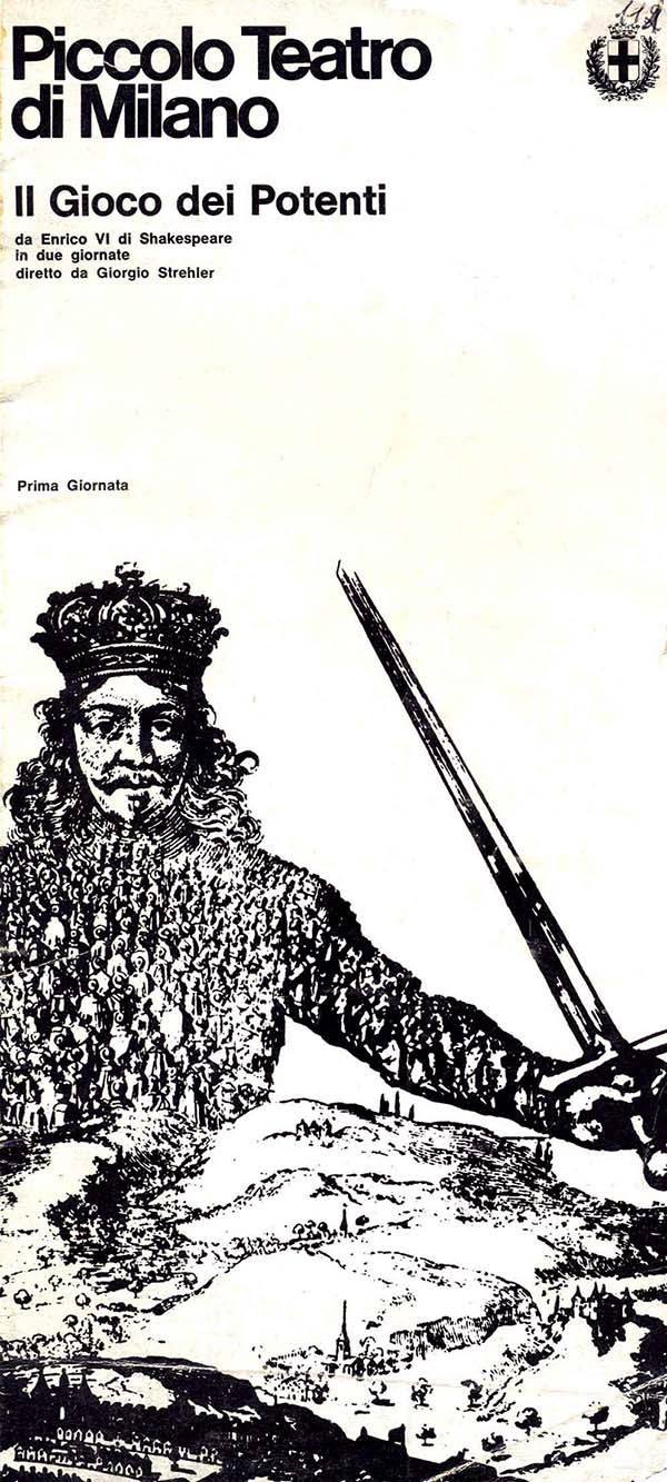 Il Piccolo Teatro della Città di Milano presenta al Teatro Lirico: Il Gioco dei Potenti (1965) – Seconda Giornata Da ENRICO VI di William Shakespeare in due giornate Interpreti principali: Franco Graziosi, Renato De Carmine, Valentina Cortese, Gabriella Giacobbe, Luciano Alberici, Corrado Pani, Lino Capolicchio, Giulio Brogi, Ugo Bologna, Mauro Di Francesco Traduzione: Cesare Vico…