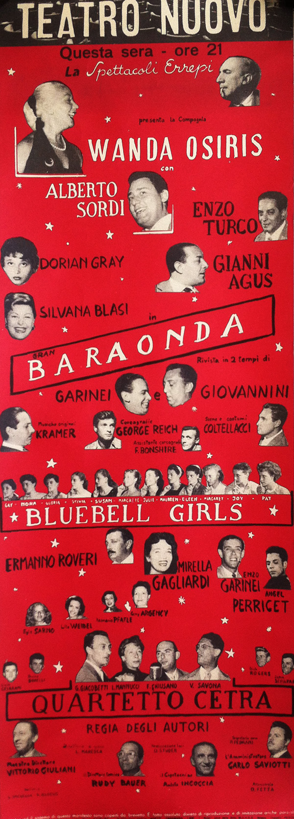 La Spettacoli Errepi presenta: Gran Baraonda (1952) Rivista in due tempi di Garinei e Giovannini Interpreti principali: Wanda Osiris, Alberto Sordi, Enzo Turco, Dorian Gray, Gianni Agus, Silvana Blasi, Enzo Garinei, Quartetto Cetra – Bluebell Girls Musiche: Gorni Kramer Coreografie: George Reich Scene e costumi: Giulio Coltellacci Regia: Garinei e Giovannini